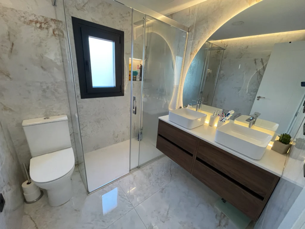 Impermeabilización completa, alicatado porcelánico, plato de ducha antideslizante a ras de suelo, grifería empotrada y mampara de vidrio templado.